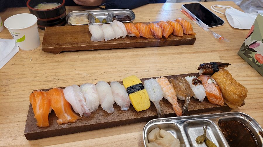 가게 문을 열고 들어서자, 생각보다 아담한 공간이 눈에 들어왔다. 테이블은 하나뿐이고, 나머지는 바 형태로 되어 있었다. 테이블 수가 적어 테이크 아웃을 전문으로 하는 듯했다. 하지만 좁은 공간임에도 불구하고, 깔끔하게 정돈된 모습과 은은하게 풍기는 스시 향이 기분을 좋게 만들었다. 나무로 된 테이블과 의자는 편안함을 더했고, 벽면에 걸린 일본풍 그림들은 이곳이 스시 전문점임을 알려주는 듯했다.