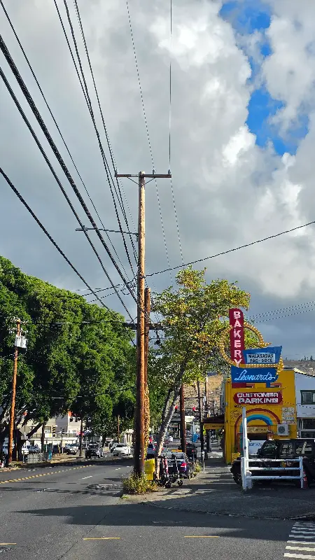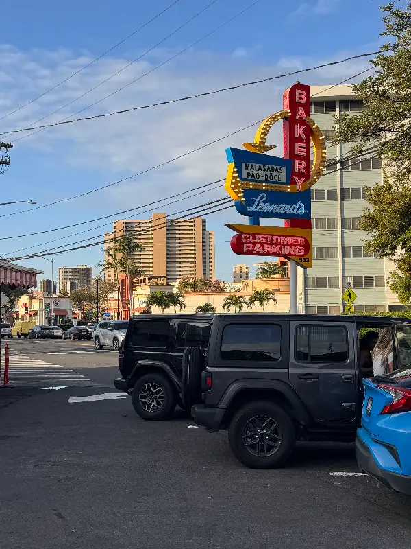 호텔을 나선 후, 정겨운 하와이 동네 풍경을 감상하며 걷다 보니 어느새 레오나즈 베이커리에 도착했다. 한적한 동네에 자리 잡은 베이커리는 화려함과는 거리가 멀었지만, 왠지 모르게 편안하고 정감 있는 분위기를 풍겼다.
