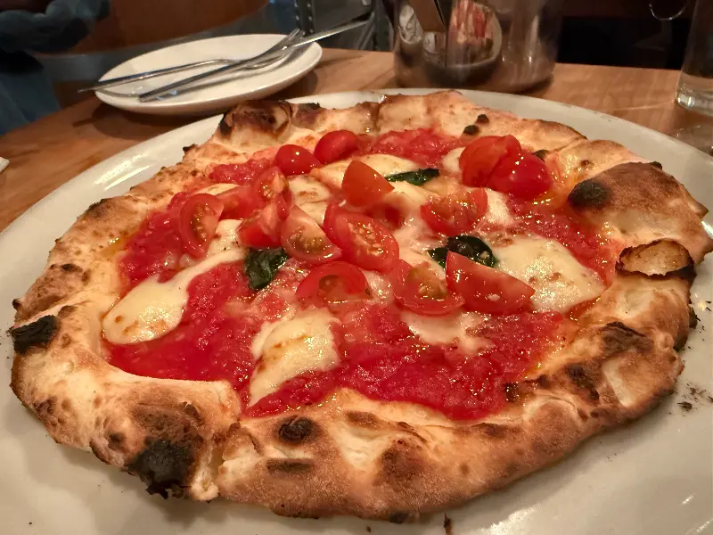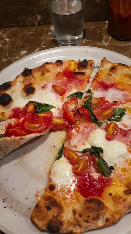 고민 끝에 마르게리따 D.O.C 피자와 흑맥주, 그리고 티라미수를 주문했다. 잠시 후, 눈 앞에 놓인 피자는 보기만 해도 황홀했다. 장작불 향이 은은하게 풍기는 쫀득한 도우 위에, 붉은 토마토 소스가 캔버스처럼 펼쳐져 있었다. 그 위에는 싱싱한 바질 잎과 탐스러운 방울토마토, 그리고 눈처럼 하얀 자연산 모짜렐라 치즈가 흩뿌려져 있었다.