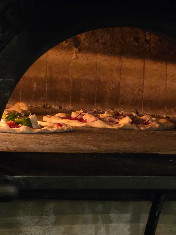 화덕 속에서 익어가는 피자, 장인의 손길이 느껴진다.