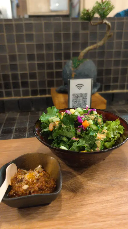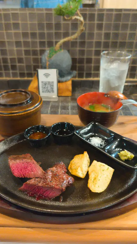 메뉴판을 정독한 끝에, 저는 점심 세트 메뉴에서 함박스테이크와 스테이크를 선택했습니다. 잠시 후, 정갈하게 차려진 음식이 테이블 위에 놓였습니다. 윤기가 흐르는 밥과 따뜻한 된장국, 그리고 신선한 샐러드가 함께 제공되었습니다. 먼저 스테이크를 맛보았습니다. 겉은 바삭하고 속은 촉촉하게 구워진 스테이크는 입안에서 살살 녹았습니다.