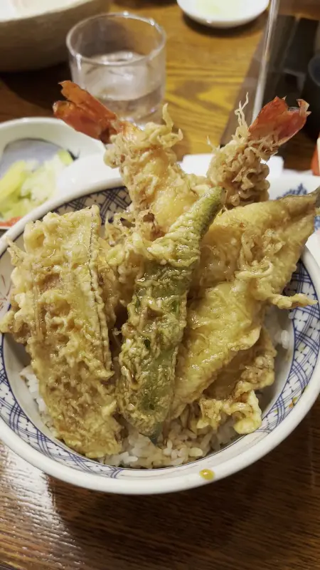 드디어 기다리고 기다리던 텐동이 나왔다. 뚜껑을 열자, 김이 모락모락 피어오르며 고소한 냄새가 코를 자극했다. 큼지막한 새우튀김 세 마리를 비롯해, 다양한 종류의 튀김이 밥 위에 푸짐하게 올려져 있었다. 튀김옷은 황금빛으로 바삭하게 튀겨져 있었고, 윤기가 자르르 흘렀다.
