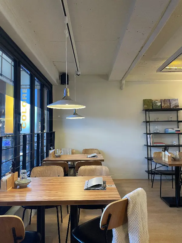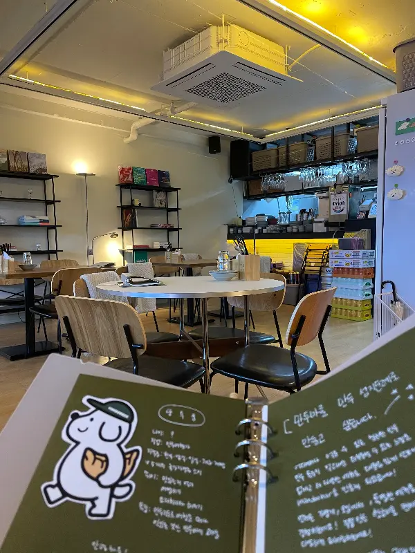 문을 열고 들어서는 순간, 따뜻한 조명과 아늑한 분위기가 편안하게 다가옵니다. 짙은 나무색 테이블과 의자는 차분함을 더하고, 벽면에 걸린 귀여운 부엉이 로고와 아기자기한 소품들은 공간에 생기를 불어넣습니다. 한쪽 벽면을 가득 채운 창밖으로는 계절의 변화를 느낄 수 있는 풍경이 펼쳐집니다. 리뷰에서 언급된 것처럼, 소개팅 장소로도 손색없을 만큼 감성적인 분위기가 인상적입니다.