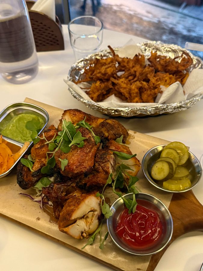 커리와 난만으로는 아쉬워, 이곳의 또 다른 대표 메뉴인 탄두리 치킨을 주문했습니다. 테이블 위에 올라온 탄두리 치킨은 그 비주얼부터 압도적이었습니다. 먹기 좋게 손질된 닭고기 조각들이 먹음직스러운 불향을 머금은 채 놓여있었고, 그 위로는 싱그러운 허브 잎이 가니쉬되어 있었습니다.