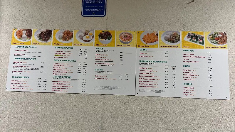 메뉴판을 살펴보니, BBQ MIX, 갈릭 쉬림프, 치킨까스 등 다양한 메뉴가 있었다. 처음 방문했기에, 점원에게 추천을 부탁했다. 친절한 점원은 BBQ MIX를 추천해주었다. 메뉴에 적힌 가격과 실제 청구 금액이 달랐지만, 세금 때문이라는 설명을 듣고 넘어갔다. 나중에 알고 보니 세금 계산이 정확하지 않았던 것 같지만, 맛있는 음식에 대한 기대감에 크게 개의치 않았다.