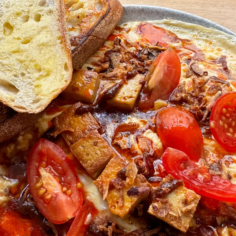 메뉴판을 펼쳐 들자 다채로운 브런치 메뉴들이 눈길을 사로잡는다. 특히 눈에 띄는 것은 두부가 들어간 특별한 메뉴. 빵과 함께 곁들여 먹으면 짠맛이 중화되어 더욱 맛있다는 후기에 기대감이 높아진다. 사진 속 붉은 빛깔의 소스와 신선한 토마토의 조화는 보기만 해도 입맛을 돋운다.