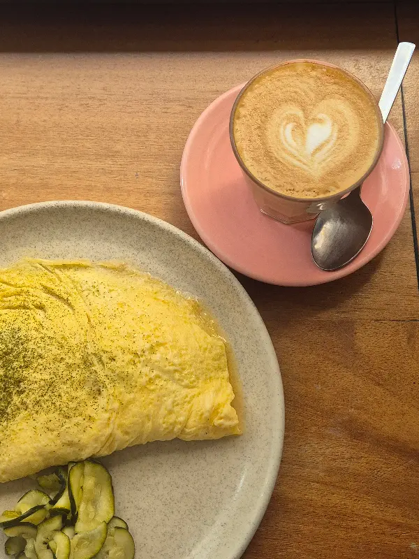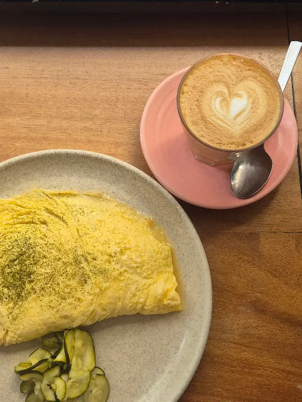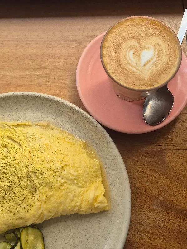 함께 곁들여 나온 커피는 핑크빛 컵에 담겨 사랑스러움을 더한다. 섬세한 하트 모양의 라떼 아트는 보는 즐거움까지 선사한다. 부드러운 오믈렛과 향긋한 커피의 조합은 완벽한 브런치 경험을 완성시켜준다.