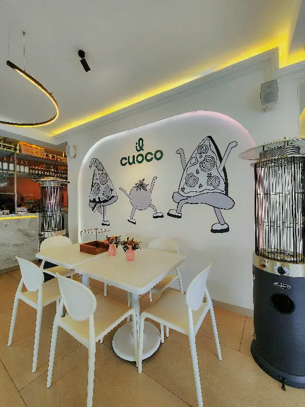 벽면에 그려진 익살스러운 피자 캐릭터가 Cuoco의 유쾌한 분위기를 더욱 돋보이게 합니다.