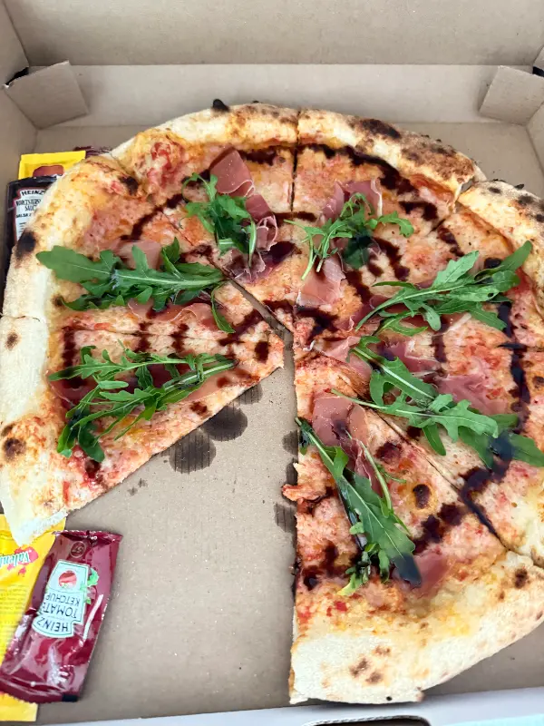신선한 루꼴라와 햄이 조화롭게 올려진 피자 한 조각. Cuoco의 피자는 재료의 신선함이 돋보입니다.