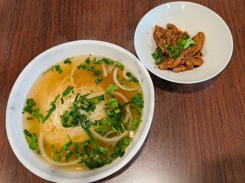 테이블 위에 놓인 쌀국수와 사테 소고기의 조화로운 모습. 깔끔한 테이블 세팅이 음식의 맛을 더욱 돋보이게 한다.