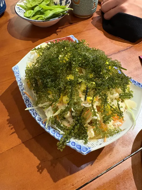 우동과 함께 우미부도 샐러드도 주문했습니다. 평소에 우미부도를 즐겨 먹는데, 이곳에서는 어떤 맛일지 궁금했습니다. 샐러드가 나오자, 톡톡 터지는 우미부도의 신선한 비주얼이 눈길을 사로잡았습니다.