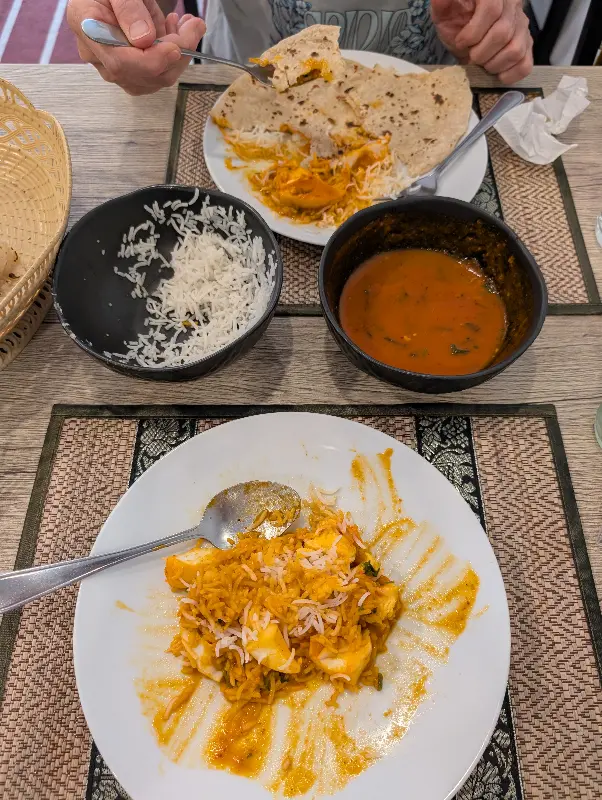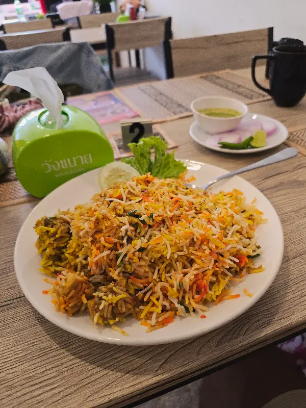 드디어, 기다리고 기다리던 치킨 비리야니가 테이블 위에 놓였다. 접시 가득 담긴 비리야니는, 황금빛 쌀알과 붉은 치킨 조각, 초록색 허브가 어우러져 아름다운 색감을 뽐냈다. 한 숟가락 크게 떠서 입안에 넣는 순간, 지금까지 경험해보지 못했던 새로운 세상이 펼쳐졌다. 쌀알 하나하나에 스며든 향신료의 향은 은은하면서도 깊었고, 닭고기는 부드럽고 촉촉했다. 특히, 맵지 않으면서도 적당히 매콤한 맛은, 젓가락을 멈출 수 없게 만드는 마성의 매력을 지니고 있었다. 사진에서 보이는 것처럼 밥알 사이사이 보이는 다채로운 색감은 시각적인 즐거움까지 더했다.