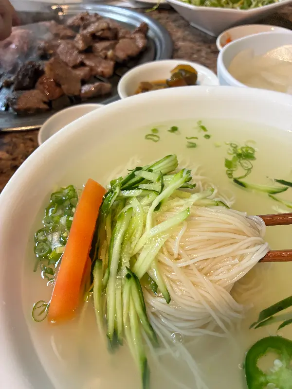 갈비를 어느 정도 먹고 나니, 시원한 동치미 국수가 간절해졌습니다. 길목식당의 동치미 국수는 이미 많은 사람들에게 사랑받는 메뉴입니다. 살얼음이 동동 뜬 동치미 국물은 보기만 해도 속이 뻥 뚫리는 듯했습니다. 국수를 한 젓가락 크게 들어 후루룩 마시니, 시원하고 새콤한 맛이 입안 가득 퍼져 나갔습니다. 특히 갈비의 느끼함을 싹 잡아주는 동치미 국물의 조화는 정말 최고였습니다. 양도 푸짐해서, 후식으로 먹기에 충분했습니다. 불고기를 먹고 동치미 국수를 먹는 조합도 추천한다고 하니, 다음에는 꼭 한번 시도해 봐야겠습니다.
