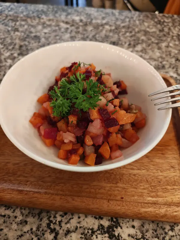특히 기억에 남는 메뉴는 솔랸카였습니다. 베트남에서 러시아 전통 스프인 솔랸카를 맛볼 수 있다는 사실에 놀랐고, 따뜻한 빵과 함께 제공되는 푸짐한 솔랸카는 아버지의 입맛에도 완벽하게 맞아떨어졌습니다. 진한 국물과 푸짐한 건더기는 추억 속의 맛을 그대로 재현해낸 듯했습니다. 비네그레트 드레싱에는 비트가 조금 부족했지만, 전체적으로 만족스러운 맛이었습니다.