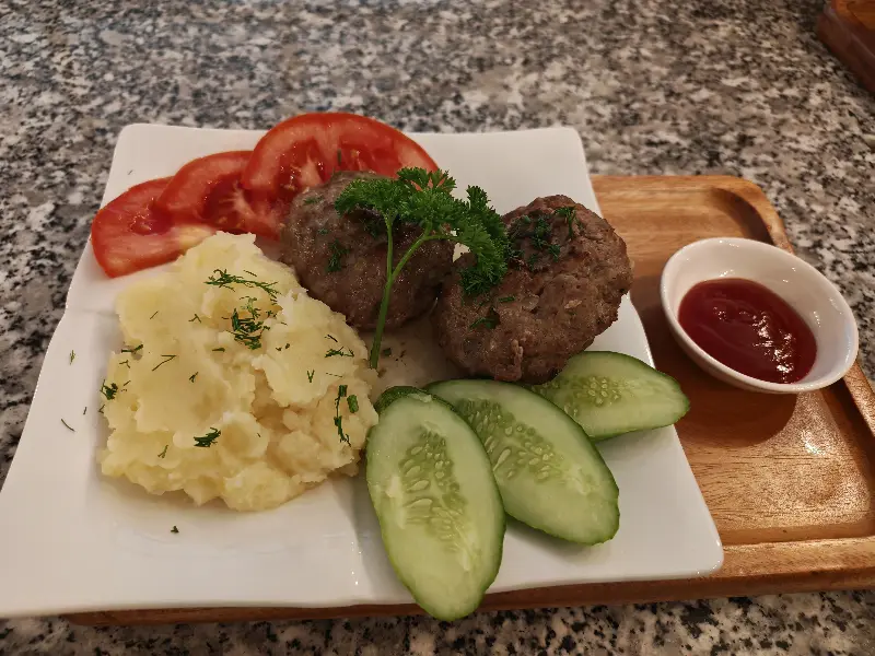 음식 맛뿐만 아니라 플레이팅에도 신경 쓴 모습이 인상적이었습니다. 커틀릿은 마늘 퓨레, 신선한 토마토와 오이 슬라이스와 함께 정갈하게 담겨 나왔고, 음식 하나하나에 정성이 느껴졌습니다. 특히 커틀릿 위에 올려진 파슬리는 신선함을 더해주었고, 보기에도 좋았습니다.