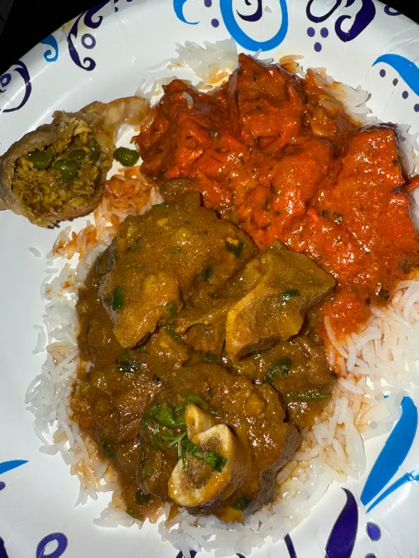 다채로운 인도 요리의 향연. 사모사, 치킨 티카 마살라, 비프 코르마 등이 한 접시에 담겨 풍성함을 더한다.
