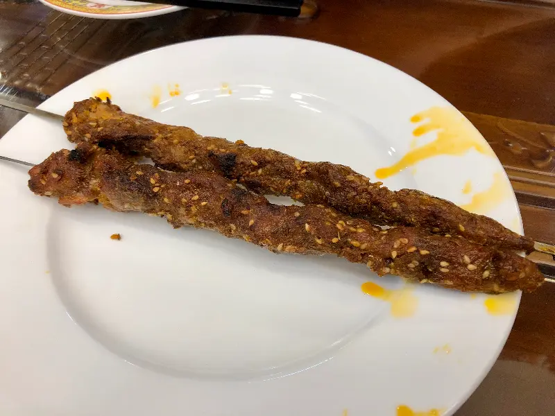 참깨 케이크는 양고기와 함께 먹는 음식이었지만, 개인적으로는 그냥 먹는 것이 더 맛있었습니다. 케이크 자체가 너무 건조해서, 양고기의 촉촉함을 덜어내는 느낌이었습니다. 하지만 양꼬치는 실망스러웠습니다. 너무 짜고, 양의 어느 부위로 만든 것인지 알 수 없을 정도로 식감이 엉망이었습니다. 양고기인지 아닌지 구별하기도 힘들 정도였습니다.
