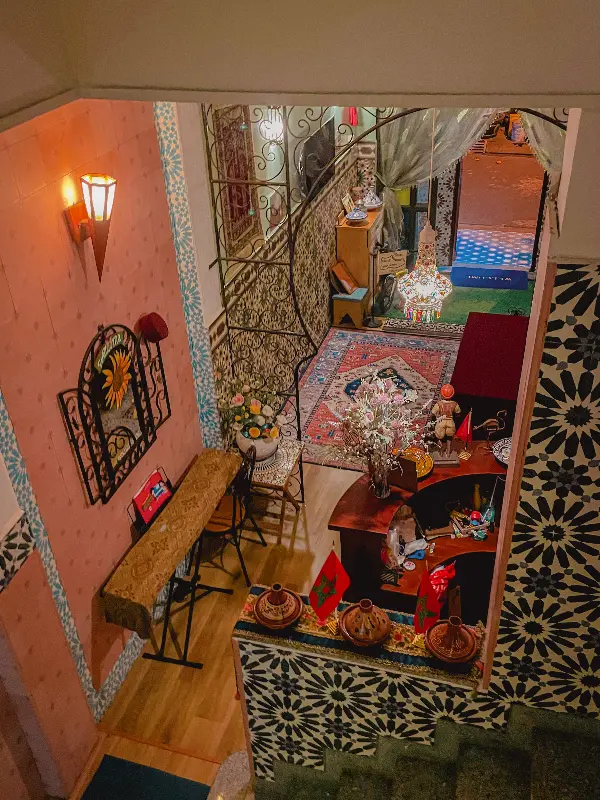 문을 열자마자 펼쳐지는 것은, 비비드한 색감과 독특한 소품들이 조화롭게 어우러진 모로코 스타일의 인테리어입니다. 마치 영화 <카사블랑카>의 한 장면 속에 들어온 듯한 착각을 불러일으키죠. 벽에는 섬세한 문양의 타일이 장식되어 있고, 앤티크한 가구와 조명들이 아늑한 분위기를 더합니다. 2층으로 올라가는 계단 옆 벽면에는 태양을 형상화한 장식과 모로코 전통 문양이 어우러져 시선을 사로잡습니다. 2층은 각 방마다 다른 컨셉으로 꾸며져 있어, 마치 보물찾기를 하는 듯한 즐거움을 선사합니다.