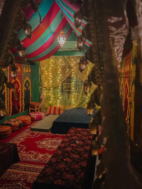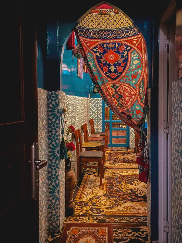 문을 열고 들어서는 순간, 화려한 모로코 스타일 인테리어가 눈을 사로잡습니다.