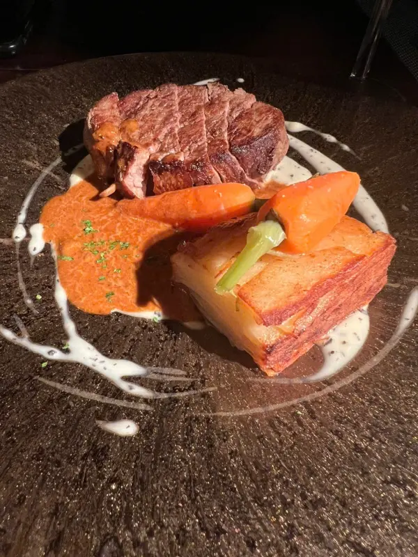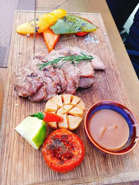 드디어 기다리고 기다리던 메인 요리가 나왔습니다. 먼저 스테이크는 겉은 바삭하고 속은 촉촉하게 잘 구워져 나왔지만, 생각보다 질긴 식감이 아쉬웠습니다. 곁들여 나온 구운 채소와 소스는 스테이크와 잘 어울렸지만, 전체적으로 가격 대비 만족도는 높지 않았습니다. 나무 도마 위에 스테이크, 구운 마늘, 구운 토마토, 구운 파프리카, 그리고 소스가 함께 플레이팅 되어 나왔습니다. 플레이팅은 정갈하고 먹음직스러워 보였습니다.