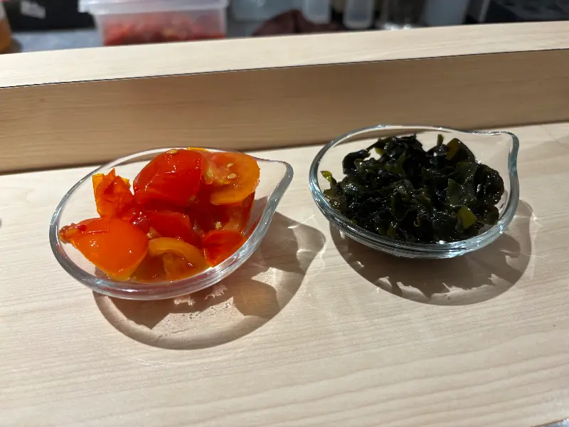 입안에 넣는 순간, 부드러운 식감과 함께 진한 육향이 입안 가득 퍼졌다. 신선한 소고기에서만 느낄 수 있는 풍미였다. 함께 제공되는 다양한 소스들은 고기 맛을 더욱 풍성하게 만들어 주었다. 파와 소금 소스는 깔끔함을 더했고, 유자 소스는 상큼함을 더했다. 특히, 방울토마토 절임은 입안을 개운하게 해주는 역할을 했다.