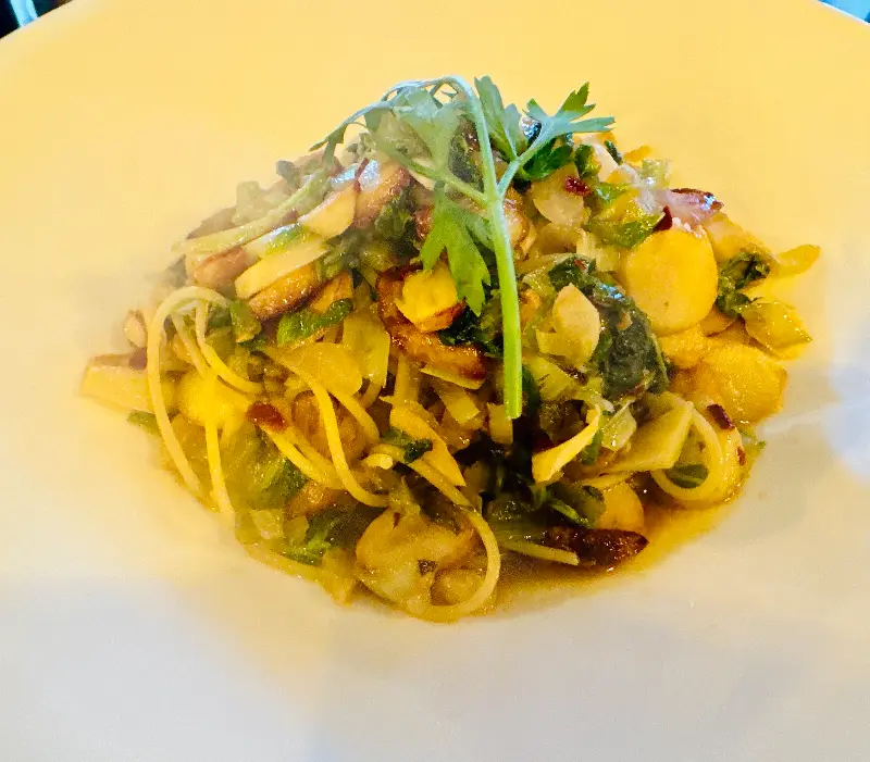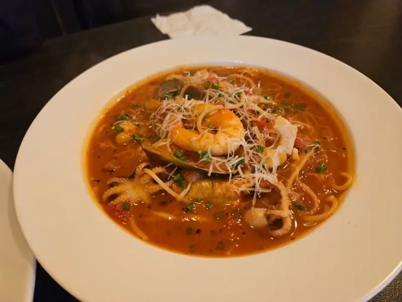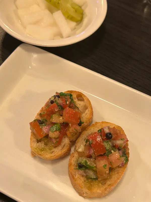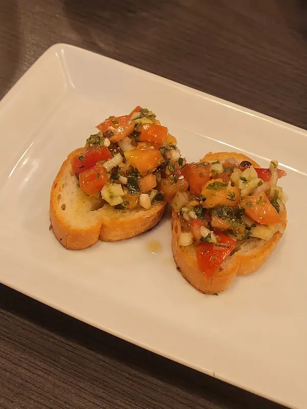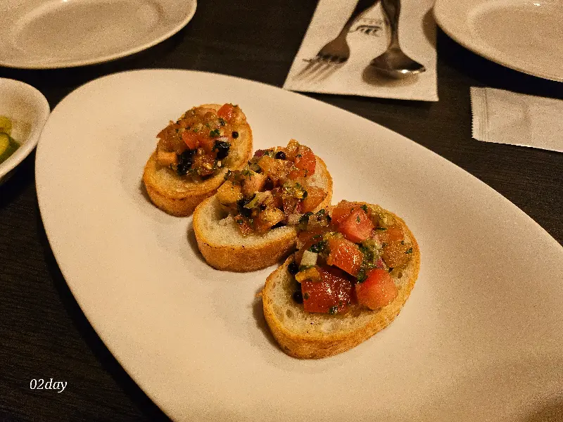 메뉴판을 펼쳐 들고 한참을 고민했다. 파스타, 리조또, 피자… 하나하나 다 맛있어 보여서 도저히 고를 수가 없었다. 결국 친구의 추천을 받아 가지 피자와 게살 파스타, 명란 리조또를 주문했다. 주문을 마치자 따뜻한 식전빵과 함께 올리브 오일이 나왔다. 빵을 뜯어 올리브 오일에 살짝 찍어 먹으니, 고소한 풍미가 입안 가득 퍼져 나갔다. 곧이어 나온 브루스케타는 신선한 토마토와 바질의 향긋함이 완벽하게 조화를 이루며 입맛을 돋우었다. 마치 이탈리아 할머니가 직접 만들어주는 듯한, 편안하고 정겨운 맛이었다.