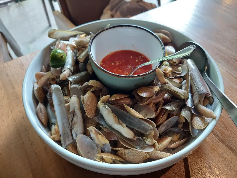 드디어 기다리고 기다리던 조개찜이 테이블에 놓였다. 싱싱한 조개들이 가득 담긴 접시에서 윤기가 흘렀다. 칠리 삼발 소스를 살짝 찍어 맛보니, 입안 가득 퍼지는 신선한 해산물의 풍미가 일품이었다. 짭짤하면서도 매콤한 소스는 조개의 감칠맛을 더욱 끌어올렸다. 젓가락질을 멈출 수 없는, 마성의 맛이었다.