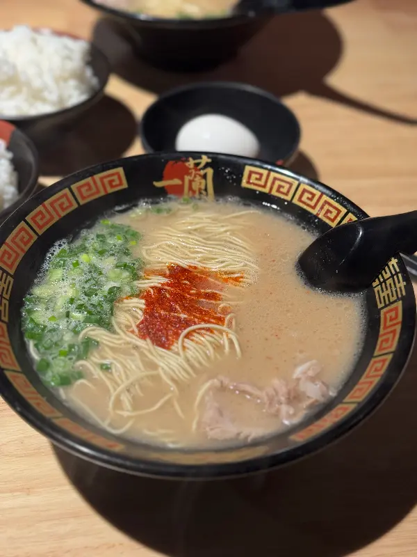 보기만 해도 군침이 도는 이치란 라멘, 붉은 비밀 소스가 식욕을 자극합니다.