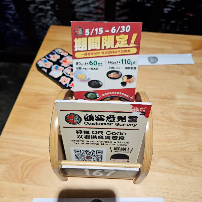 이치란 침사추이점은 늦은 시간까지 영업한다는 점이 매력적이었습니다. 밤 9시가 넘은 시간이었지만, 매장 안은 여전히 활기가 넘쳤습니다. 일본에서 흔히 보던 독서실 같은 1인석은 아니었지만, 테이블 좌석으로 안내받아 편안하게 식사를 즐길 수 있었습니다. 매장 안쪽으로 들어서니 테이블마다 번호가 매겨져 있고, QR코드를 이용해 주문과 결제를 진행하는 시스템이었습니다. 처음에는 다소 복잡하게 느껴졌지만, 이 또한 새로운 경험이라는 생각에 즐겁게 따라 했습니다.