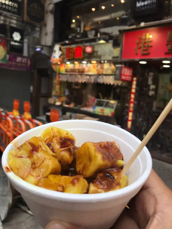 완차이 거리를 걷다 보면 다양한 길거리 음식들을 만날 수 있습니다. 그중에서도 특히 눈에 띄는 것은 저렴한 가격에 판매되는 슈마이와 피시볼입니다. 단돈 10홍콩달러에 10개나 되는 피시볼을 맛볼 수 있다는 사실은 놀라울 따름입니다. 어떤 날은 1+1 행사까지 진행한다고 하니, 저렴한 가격에 간식을 즐기려는 사람들에게는 더할 나위 없이 좋은 기회입니다.