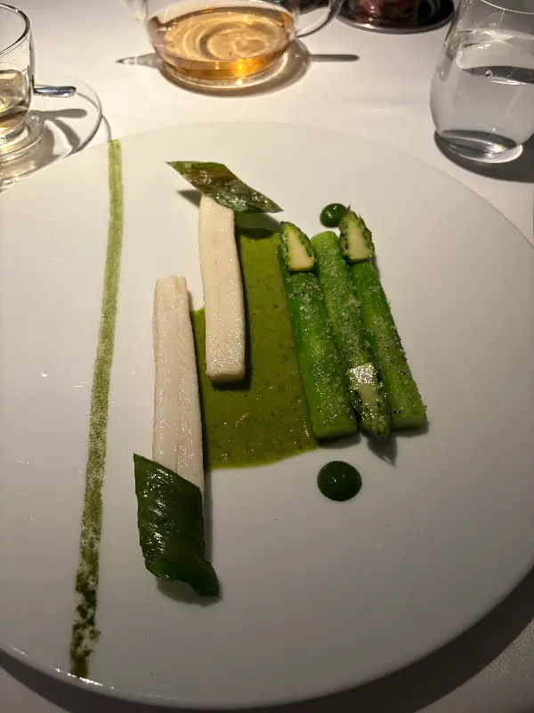 아스파라거스와 신선한 재료들의 조화가 돋보이는 에피타이저. 섬세한 플레이팅이 눈길을 사로잡는다.