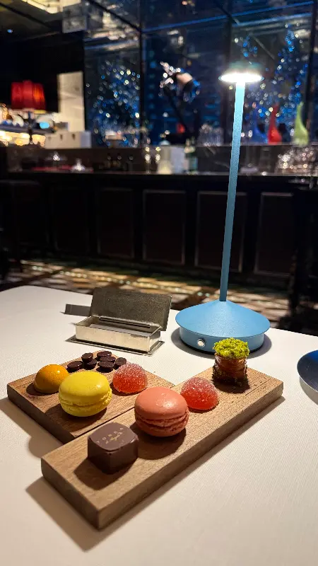 식사 후 제공되는 디저트 트레이는 달콤한 마카롱과 젤리, 초콜릿 등으로 구성되어 완벽한 마무리감을 선사합니다.