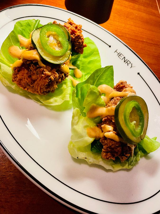 또 다른 이색적인 애피타이저로는 바삭하게 튀겨진 치킨이 신선한 양상추 위에 올려지고 할라피뇨 슬라이스와 특별한 소스가 더해진 요리가 있습니다. 한입 베어 물면 바삭함과 부드러움, 그리고 매콤함이 조화롭게 어우러져 미각을 즐겁게 자극합니다. 이는 헨리 레스토랑이 고전적인 스테이크 요리 외에도 독창적이고 현대적인 메뉴들을 선보이며 방문객들에게 끊임없는 미식의 즐거움을 선사하려는 노력을 엿볼 수 있는 대목입니다.