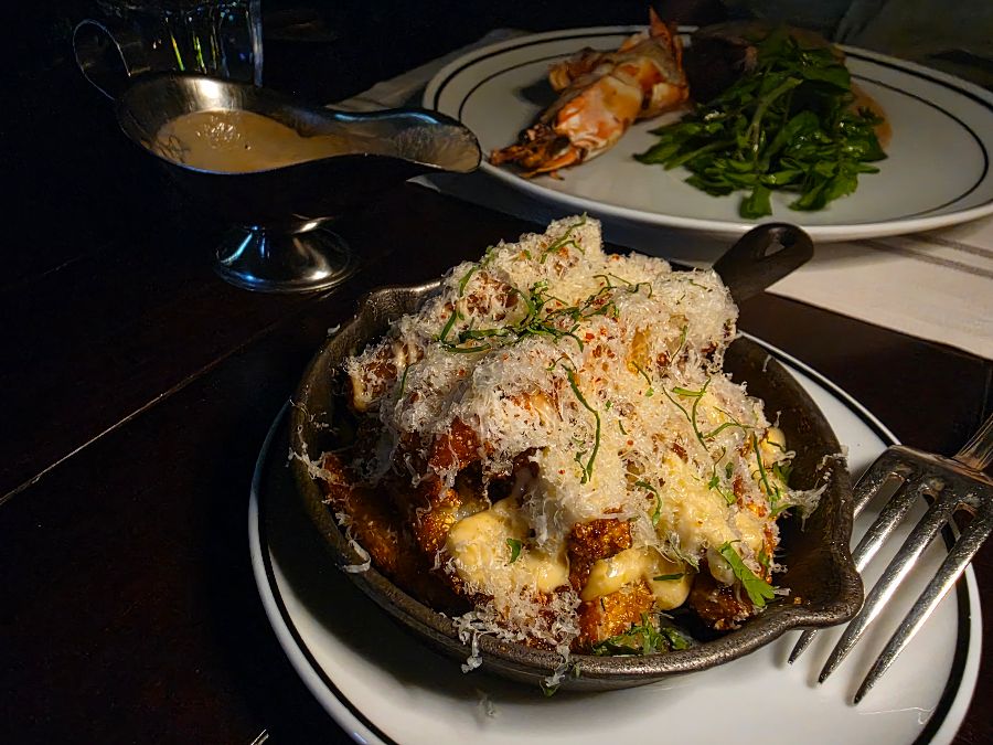 스테이크와 함께 즐길 수 있는 특별한 사이드 메뉴 중 하나는 바로 진한 치즈 소스와 함께 버섯, 파스타 등이 어우러진 요리입니다. 멜팅 치즈가 듬뿍 뿌려져 먹음직스러운 비주얼을 자랑하며, 따뜻하고 풍부한 맛으로 스테이크의 풍미를 더욱 돋보이게 합니다. 넉넉하게 뿌려진 치즈와 향긋한 허브는 그 자체로 하나의 완벽한 요리이며, 편안하면서도 고급스러운 맛을 선사합니다.