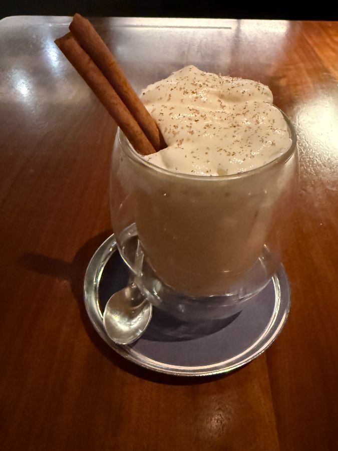 또한, 식사와 함께 곁들이기 좋은 다양한 음료들도 준비되어 있습니다. 특히 따뜻한 라떼 위에 시나몬 스틱이 올려진 음료는 아늑한 분위기와 완벽하게 어울려 식사의 여운을 더욱 길게 만들어줍니다. 부드러운 거품과 향긋한 시나몬 향이 어우러져, 마치 크리스마스 시즌의 포근함을 연상시키는 듯합니다.