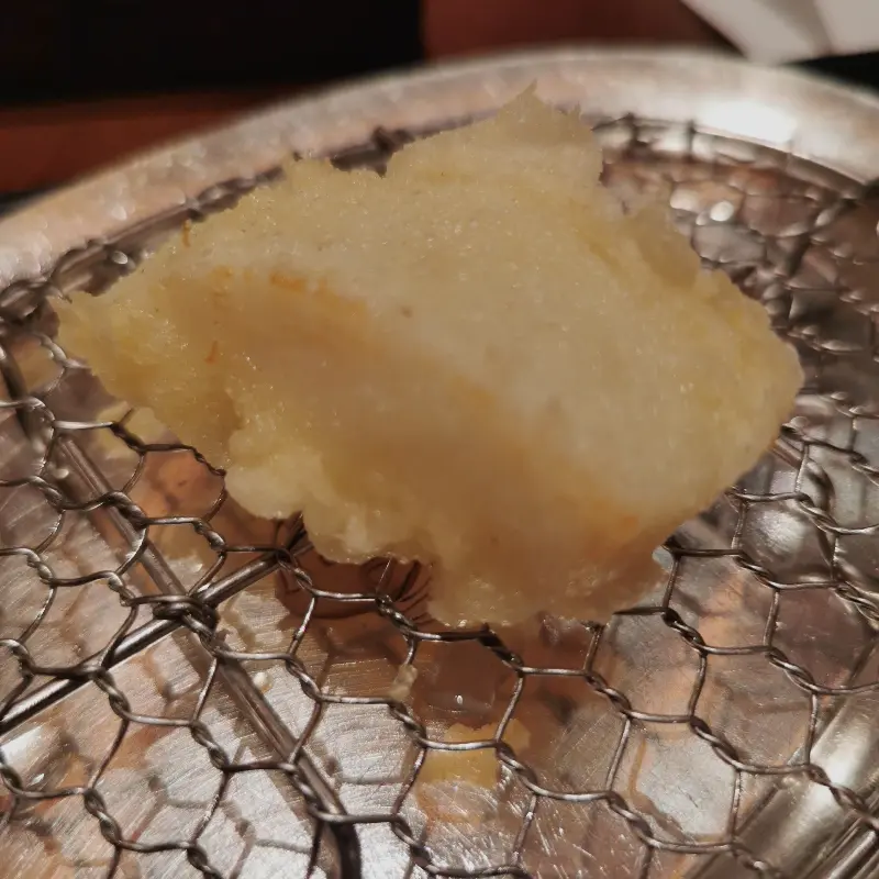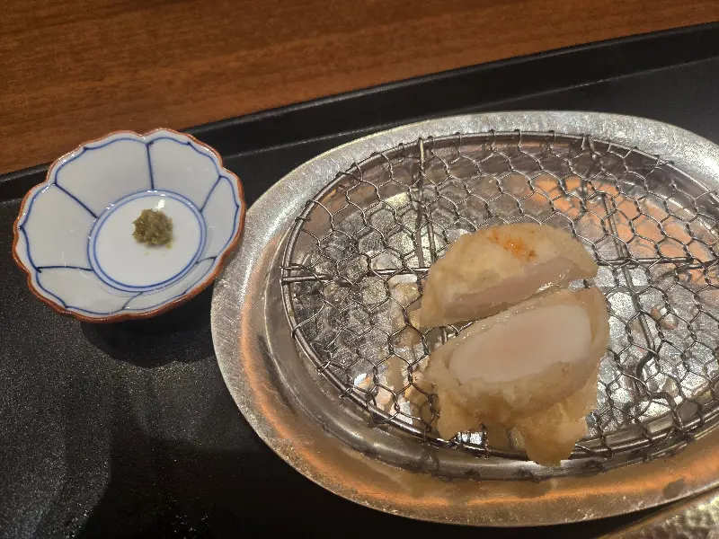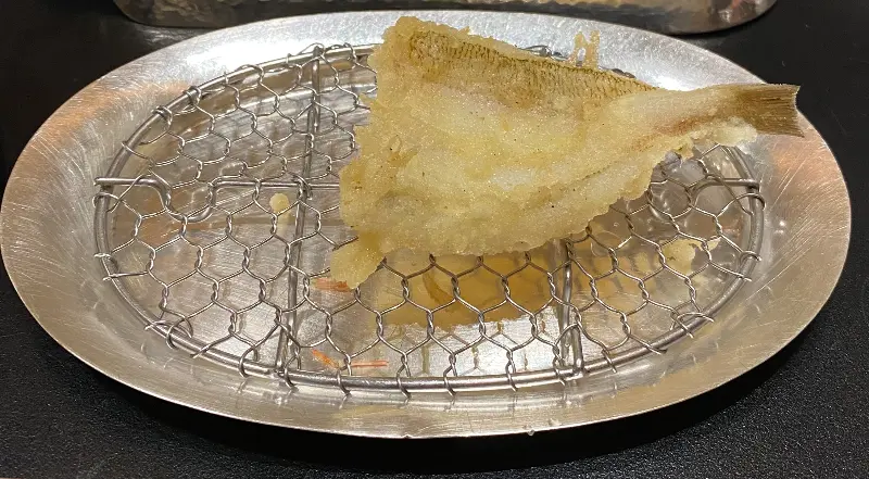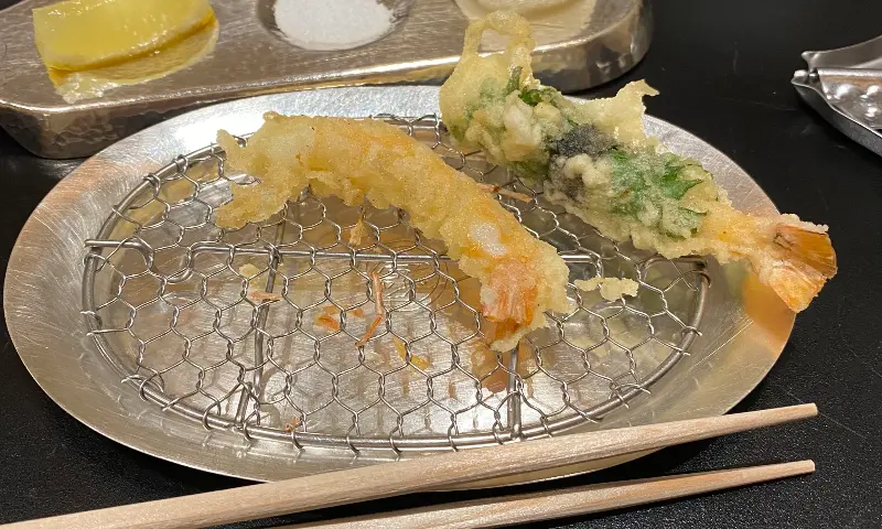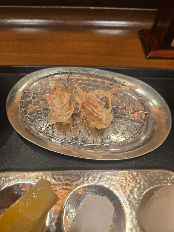 가장 먼저 맛본 것은 새우 튀김. 얇고 바삭한 튀김옷 속에는 촉촉하고 탱글탱글한 새우 살이 가득 차 있습니다. 한 입 베어 무는 순간, 입안 가득 퍼지는 새우의 풍미와 튀김의 고소함이 환상적인 조화를 이룹니다. 튀김 자체의 맛도 훌륭하지만, 곁들여 먹는 소금, 레몬, 간 무와의 조합 또한 훌륭합니다.