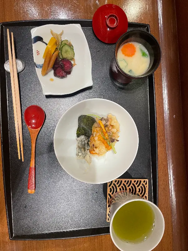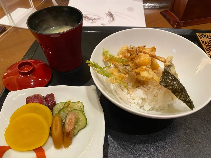 식사 후반부에는 튀김 덮밥이 제공됩니다. 갓 지은 따뜻한 밥 위에 다양한 튀김과 특제 소스가 뿌려져 나옵니다. 튀김의 느끼함을 잡아주는 깔끔한 소스와 밥의 조화는 훌륭했습니다. 튀김만 먹었을 때와는 또 다른 매력을 느낄 수 있었습니다.