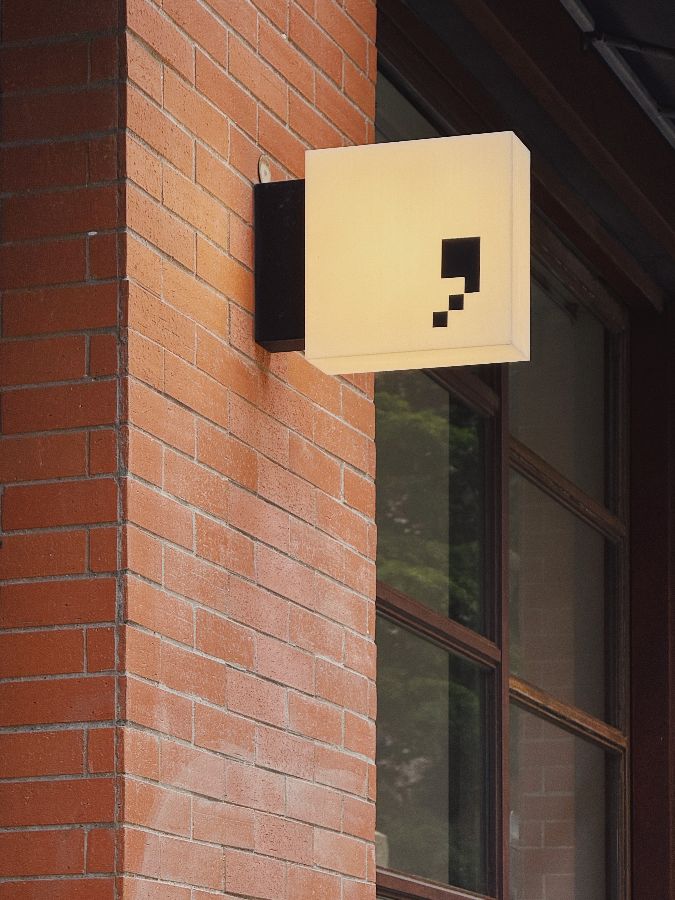벽돌 건물에 콤마 모양의 간판이 작고 눈에 띄게 달려 있습니다.