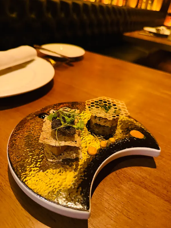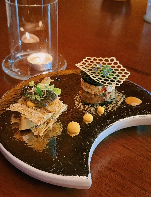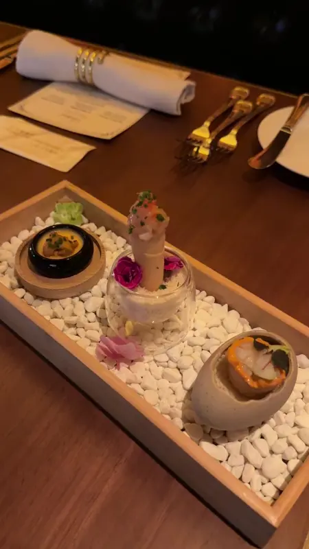 저희는 1,388달러짜리 10코스 테이스팅 메뉴를 주문했습니다. 식사가 시작되기 전, 아뮤즈 부쉬가 나왔습니다. 한 입 크기의 작은 요리였지만, 그 맛은 놀라울 정도로 섬세하고 풍부했습니다. 신선한 해산물의 풍미와 향긋한 허브의 조화가 입안 가득 퍼져 나갔습니다. 마치 오케스트라의 서곡처럼, 앞으로 이어질 요리에 대한 기대감을 한껏 높여주는 맛이었습니다.