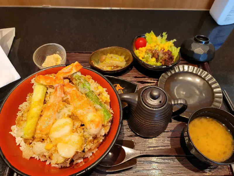 정갈하게 차려진 한 상, 튀김 덮밥과 곁들임 메뉴들이 보기만 해도 식욕을 자극한다.