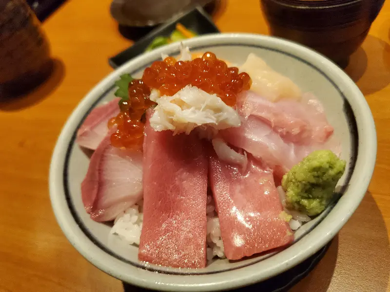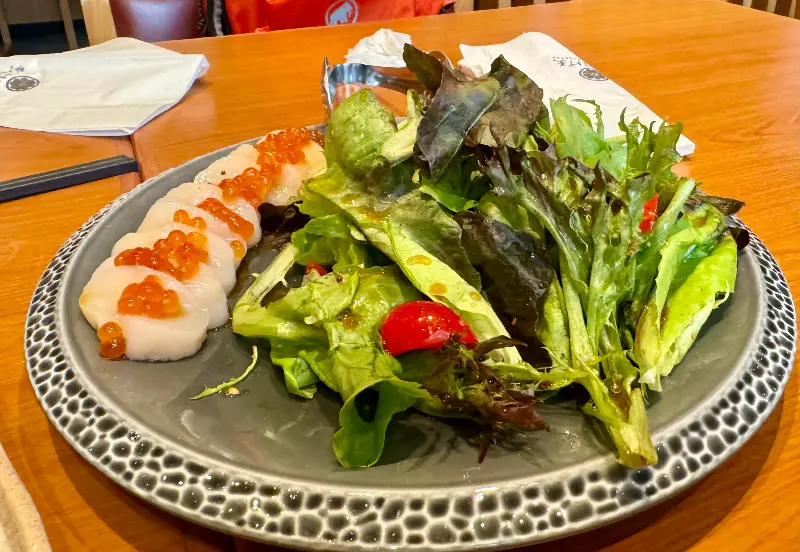 고심 끝에, 나는 가리비 샐러드, 스시미 모듬, 튀김 모듬, 구운 돼지고기 덮밥, 그리고 A5 소고기 구이 세트를 주문했다. 주문 후 얼마 지나지 않아, 정갈하게 차려진 음식들이 테이블 위를 가득 채웠다.