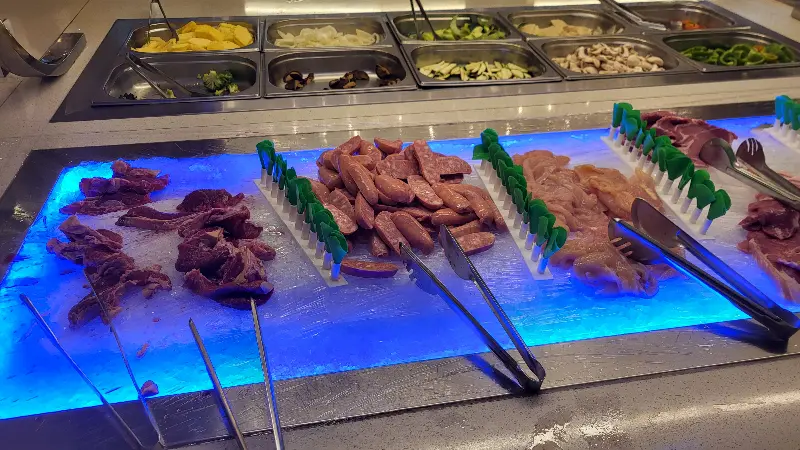 자리를 안내받고 뷔페 코너로 향했다. 가장 먼저 눈에 띈 것은 신선한 해산물이 가득한 코너였다. 붉은 새우, 윤기가 흐르는 연어, 쫄깃한 문어 등 다양한 해산물이 얼음 위에 가지런히 놓여 있었다. 옆쪽에는 소고기와 닭고기 등 날고기를 직접 골라 구워 먹을 수 있는 코너도 마련되어 있었다.