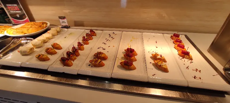 스시 코너에는 다양한 종류의 스시와 롤이 준비되어 있었다. 특히 연어 스시는 90%가 연어로 만들어져 있어 연어 애호가들에게는 천국과도 같은 곳이었다. 밥알 하나하나가 살아있는 듯한 식감과 신선한 연어의 조화는 입안에서 황홀한 맛을 선사했다. 스시를 한 입 베어 무는 순간, 은은한 쌀의 단맛과 신선한 해산물의 풍미가 입안 가득 퍼져 나갔다. 특히, 톡톡 터지는 날치알이 올라간 롤은 씹는 재미까지 더해져 젓가락을 멈출 수 없게 만들었다.