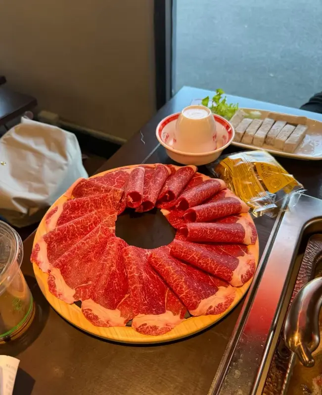 곧이어 테이블 위에는 신선한 채소, 고기, 해산물 등 다양한 재료들이 푸짐하게 차려졌다. 붉은 빛깔의 소고기는 윤기가 좌르르 흘렀고, 싱싱한 채소들은 생기를 뽐냈다. 훠궈 냄비 안에서 보글보글 끓는 육수는 매콤한 향을 풍기며 식욕을 자극했다.