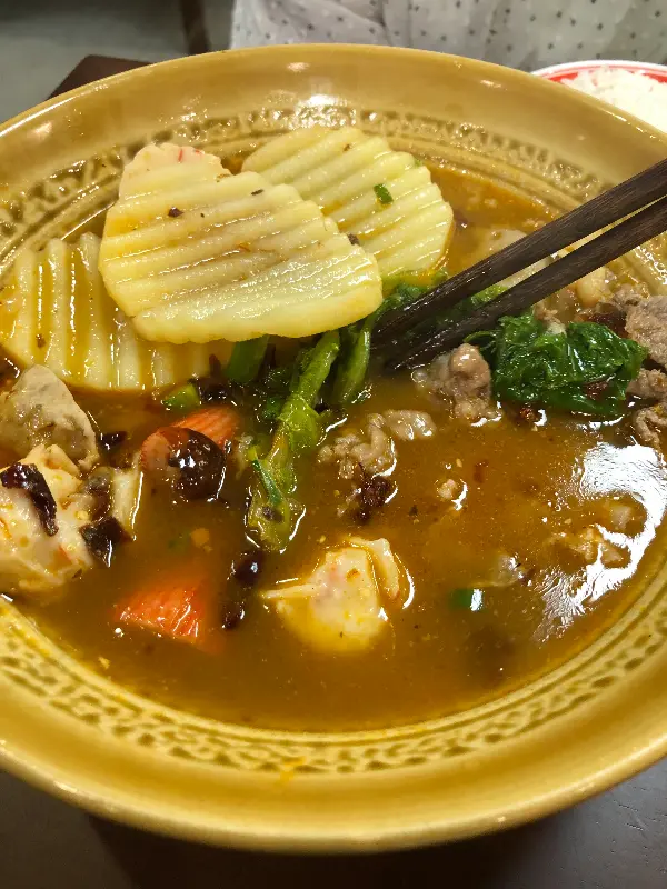매콤한 훠궈 국물은 밥과 환상적인 궁합을 자랑한다.