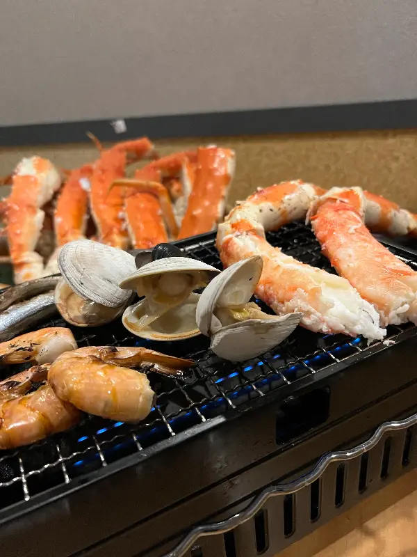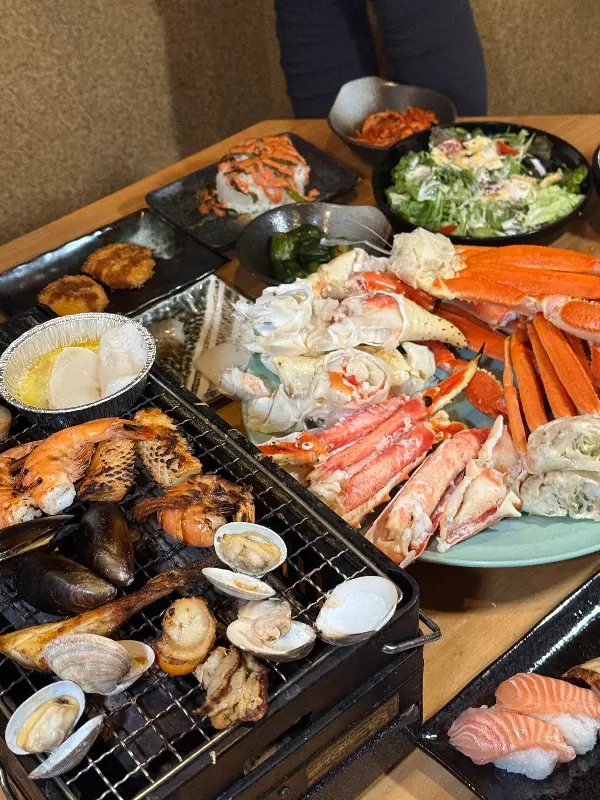 다양한 해산물을 한 번에 즐길 수 있는 화로구이. 신선한 새우, 조개, 오징어 등을 직접 구워 먹는 재미가 있습니다.