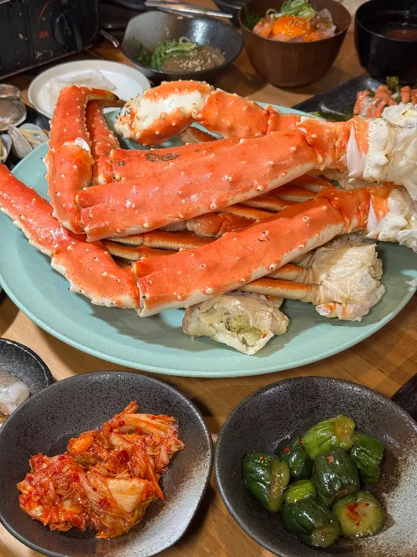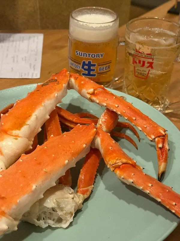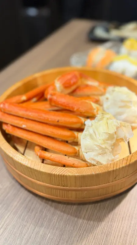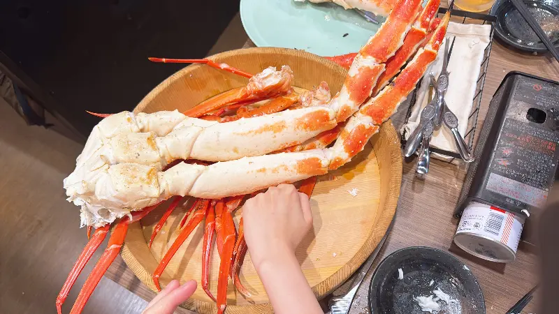 게구라 우메다점의 대표 메뉴는 단연 대게 무한리필입니다. 주말에는 7,500엔부터 시작하는 무한리필 메뉴는 가격이 조금 있지만, 신선하고 푸짐한 게를 마음껏 즐길 수 있다는 점에서 전혀 아깝지 않았습니다. 커다란 접시에 가득 담겨 나온 게를 보는 순간, 탄성이 절로 나왔습니다. 붉은 빛깔을 뽐내는 게 다리는 보기만 해도 군침이 돌았습니다.