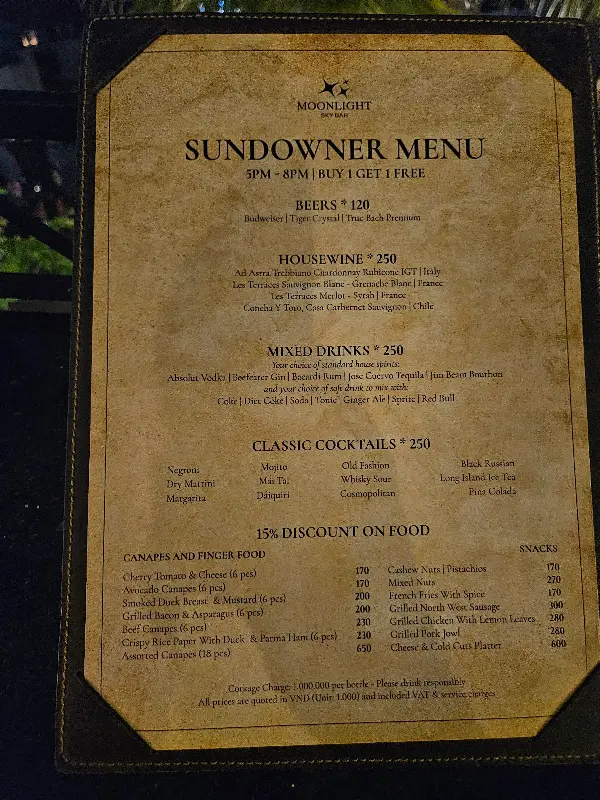 메뉴판을 살펴보니, 맥주, 와인, 칵테일 등 다양한 종류의 음료가 준비되어 있었다. 특히 5시부터 8시까지는 해피아워로, 일부 음료를 buy 1 + get 1으로 즐길 수 있다는 점이 매력적이었다. 가격은 베트남 물가치고는 다소 높은 편이지만, 분위기와 서비스를 고려하면 충분히 합리적인 가격이라고 생각되었다.