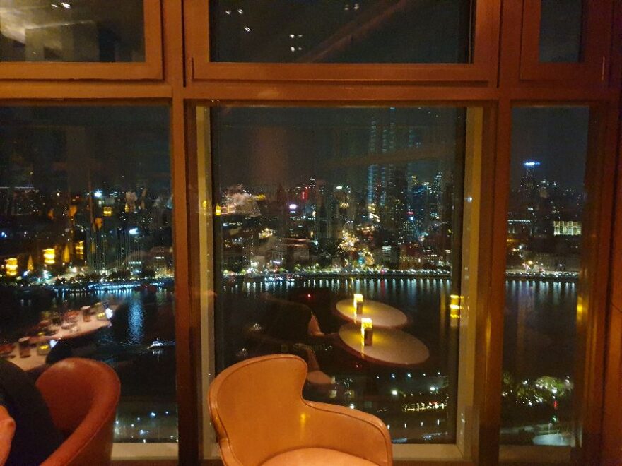엘리베이터 문이 열리는 순간, 눈 앞에 펼쳐지는 광경에 저도 모르게 숨을 멈췄습니다. 통유리창 너머로 펼쳐진 상하이의 야경은 사진으로 보는 것과는 비교할 수 없을 정도로 아름다웠습니다. 마치 하늘에서 쏟아지는 별들을 손에 잡을 수 있을 것만 같은 기분이었죠. 은은한 조명 아래 놓인 테이블과 편안한 의자는 아늑하고 고급스러운 분위기를 더했습니다. 창밖을 바라보며 잠시 넋을 놓고 감탄사를 연발했습니다.