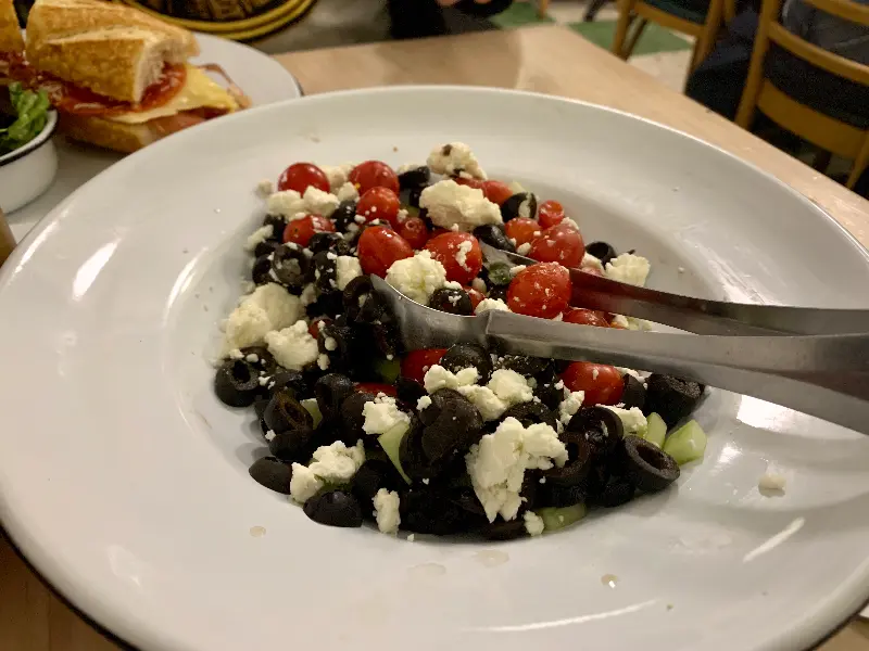 신선한 올리브와 토마토, 치즈가 어우러진 샐러드. 상큼하면서도 고소한 맛이 입맛을 돋운다.